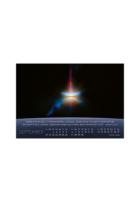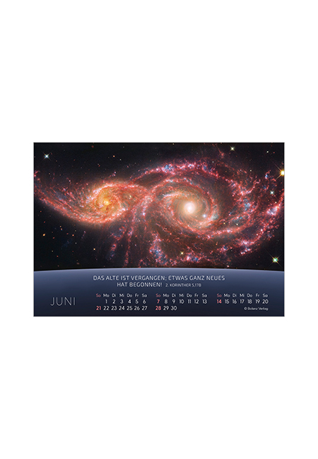Die fantastischen und besonders farbintensiven Aufnahmen der größten Teleskope enthüllen ein wenig die gewaltige Dimension des Universums. Astrophysiker Dr. Norbert Pailer erläutert die Faszination des Weltalls in Texten auf der Rückseite des Kalenders und verbindet darin die überwältigende Tatsache, dass der Schöpfer dieses gewaltigen Universums uns ganz nah ist. Zusätzlich werden Detailaufnahmen von Sternen und aus der Raumfahrt gezeigt.