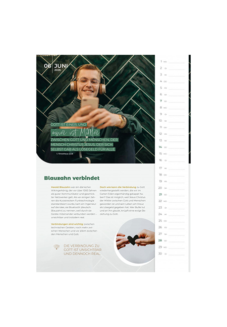 Dieser Monatskalender im modernen Design mit Platz für persönliche Termine, tollen Fotos und interessanten Gedankenanstößen richtet sich (nicht nur) an junge Leute und lädt sie zum Glauben an Jesus Christus ein.
