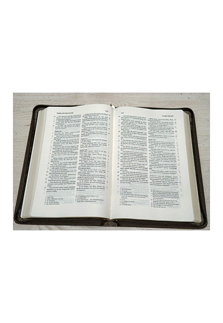 Die Bibel verfügt über ein ausgezeichnetes zweispaltiges Schriftbild. Im Anhang befinden sich Worterklärungen, Maße/Gewichte, Tabellen und farbige Karten.