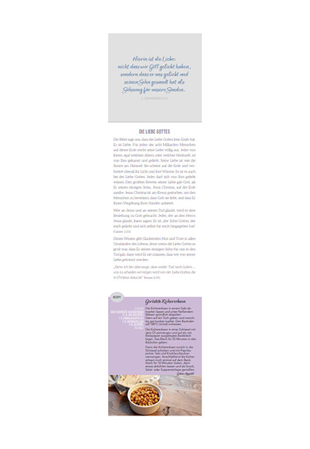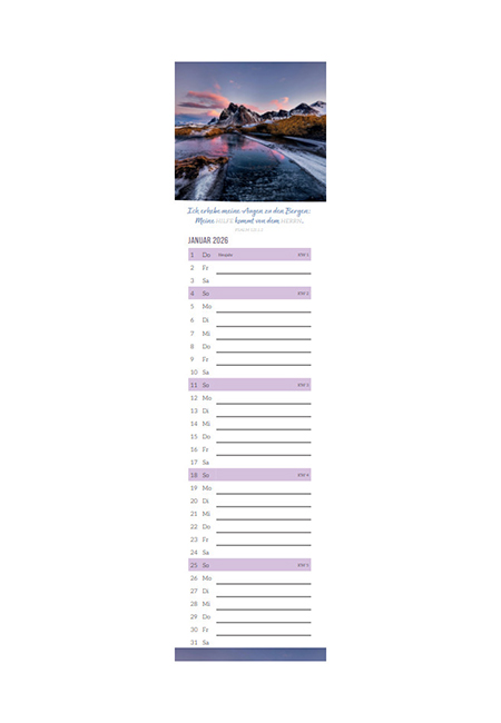Dieser Streifen-Terminkalender mit schönen Fotos und Bibelversen eignet sich, um wichtige Termine übersichtlich festzuhalten. Aber nicht nur das: die Texte auf der Rückseite laden ein, sich auf ein Leben mit Jesus Christus einzulassen und den Lebensweg an Gottes Hand mit Zuversicht zu gehen. Zusätzlich bietet der Kalender abwechselnd bebilderte Lesetipps und Kochrezepte.