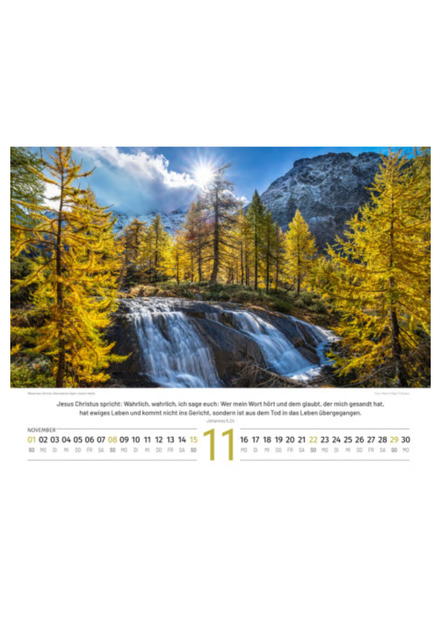 Mit zwölf schönen Bildern aus der Schweiz beeindruckt dieser schon seit vielen Jahren beliebte Kalender. Die ausgewählten Bibelverse sind sowohl evangelistisch als auch glaubensstärkend. Ein schönes Geschenk für Bergliebhaber.